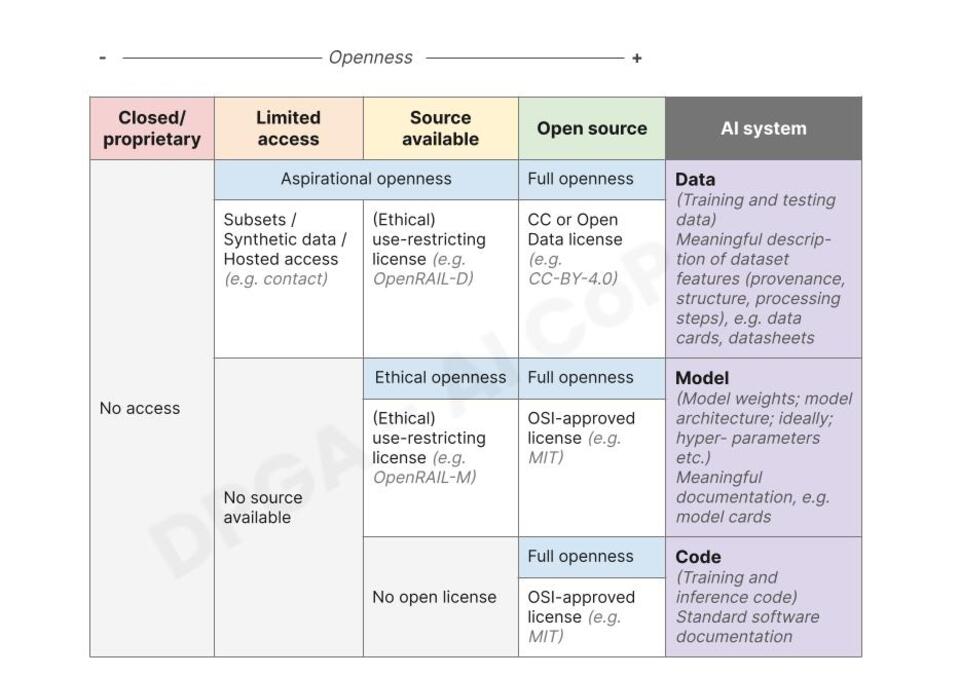 - Establishing a framework for a gradient approach to the openness of AI system components, and;